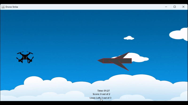 A Java game that lets the player control a drone and can shoot other spaceships coming from the other direction. Game is drawn using the Swing framework. Collision is implemented using bounding hit boxes.